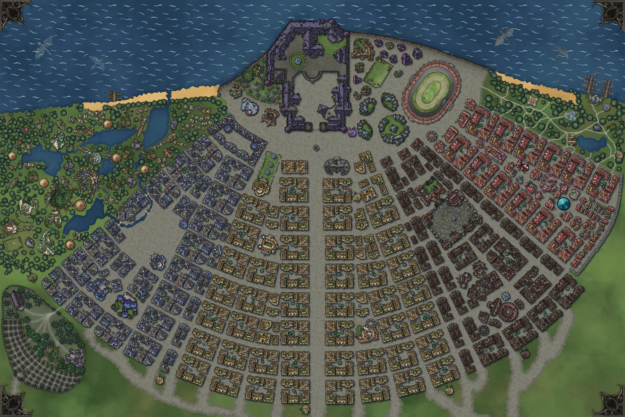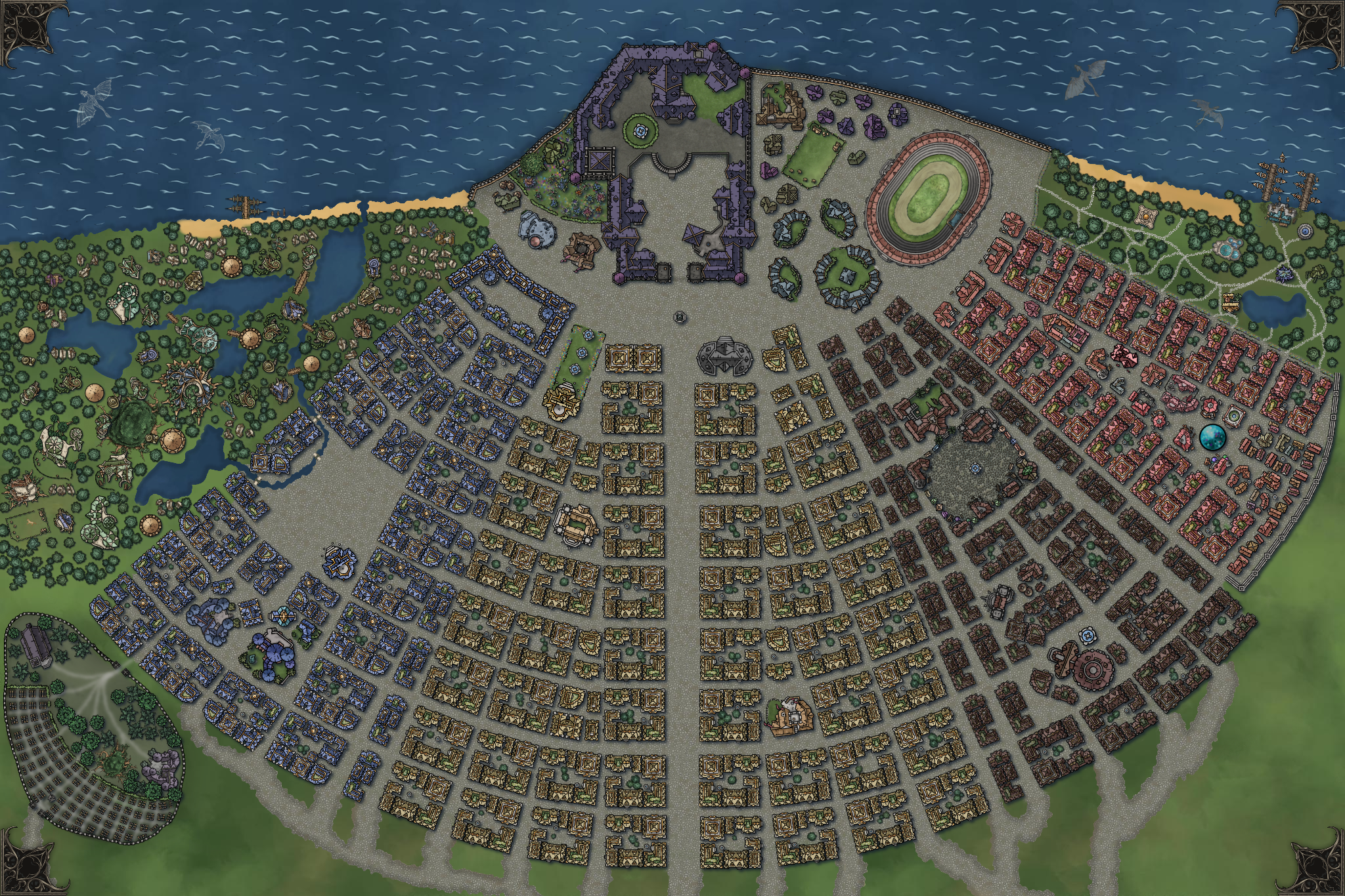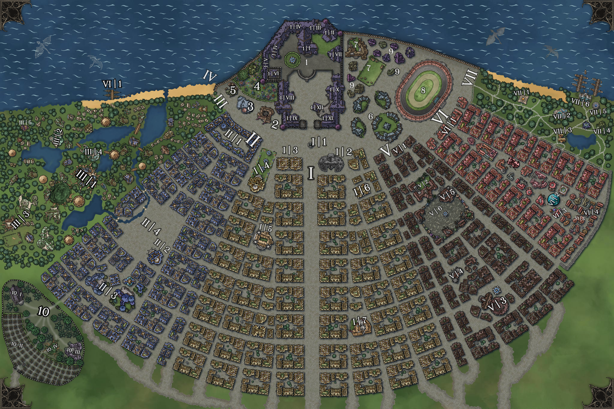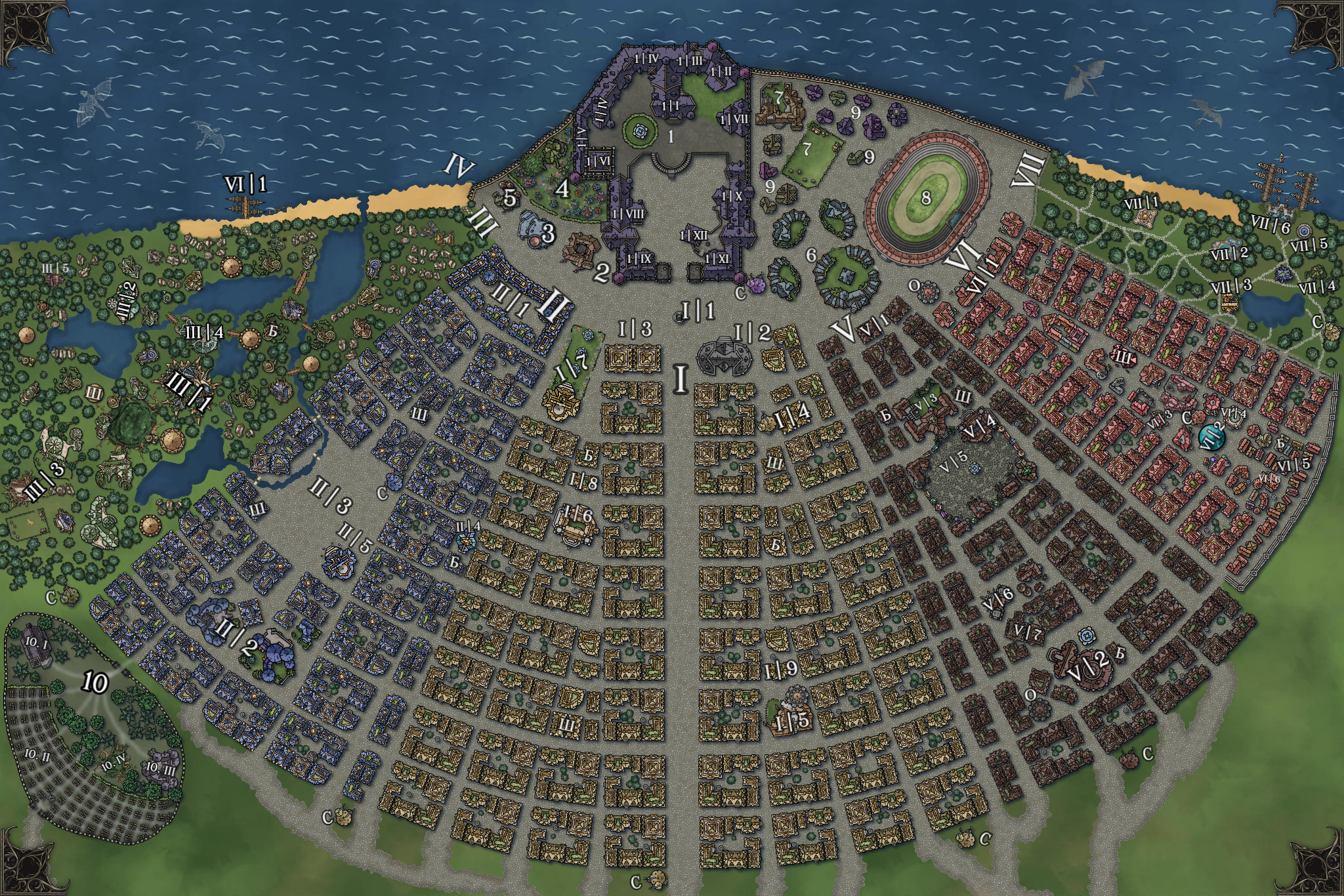 Магический луч. Застройка этого квартала кажется чуть более хаотичной, но то оправдано тем, что негласным сердцем этого луча является площадь, именуемая Драконьим плацем. Эта территория никогда не застраивается и достаточно велика для того, чтобы там смогли разминуться сразу несколько драконов в истинных обликах. Кроме домов зажиточных волшебников, здесь расположилось множество лавок, мастерских и несколько крупных гильдейских домов. Особенно сильно среди них выделяется главный Дом Совета Магов, где проходят собрания и дружеские встречи. В конце квартала находится сектор частной застройки. Все здания здесь имеют синие крыши, но корпус всё так же песчаного оттенка. Вершиной луча является Библиотека Древностей, доступ к которой имеют все ученики и преподаватели Академии. Разовое посещение возможно после заполнения документов и символической платы в виде пары серебряных за вход. Внутри Библиотеки хранятся свитки не только по общим направлениям, но и особые. Для получения к ним доступа ученикам необходима бумага, заверенная подписью их куратора.